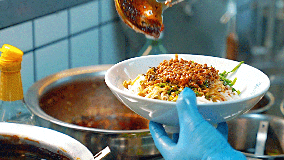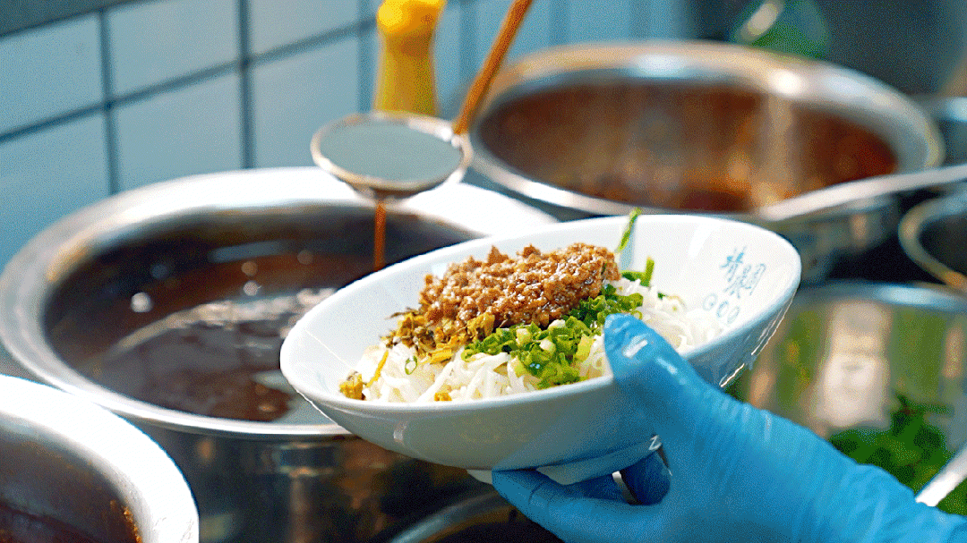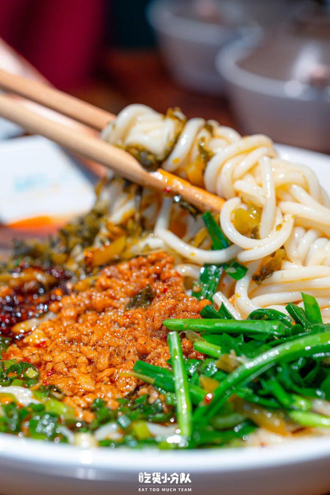 最后的加料过程酣畅淋漓。一勺浓郁的甜咸酱油泼洒于现熬肉酱之上,“哗”的一声,便已将蒸饵丝的调味篇章谱写大半。腌菜碎、韭菜段、小葱花、辣椒油也不甘示弱,即将各显神通。