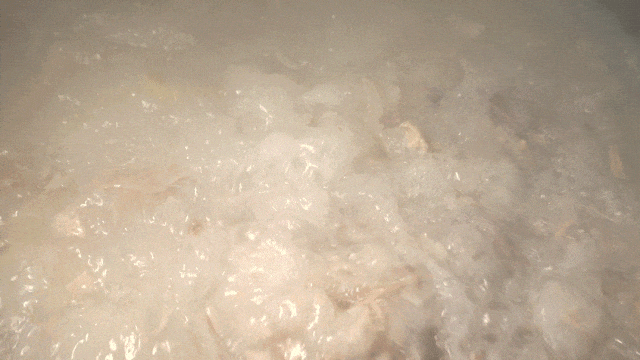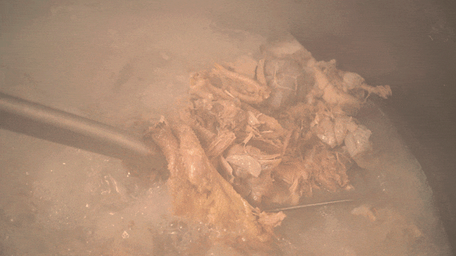 米线好,汤也同样重要。后厨有一口巨大的汤锅,每天都要开火熬煮4小时,把骨头里的肉香味儿全都吊出来。这样煮出的米线才能十足鲜美~