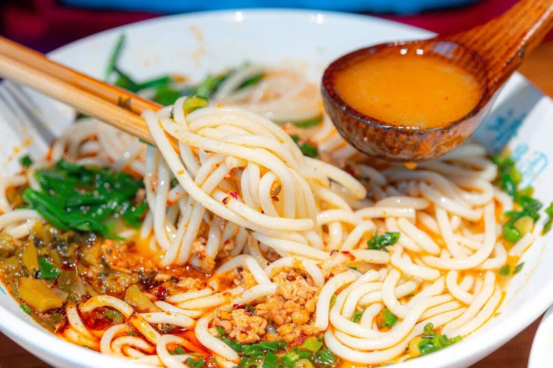 馄饨的形状跟咱们常吃的不同,是个长条形的小包袱。皮还比较柔韧,特别挂香辣的汤汁,里面是鲜肉馅儿的。还有葱花提香,整体吃起来鲜鲜辣辣,还能发点汗,很痛快~
